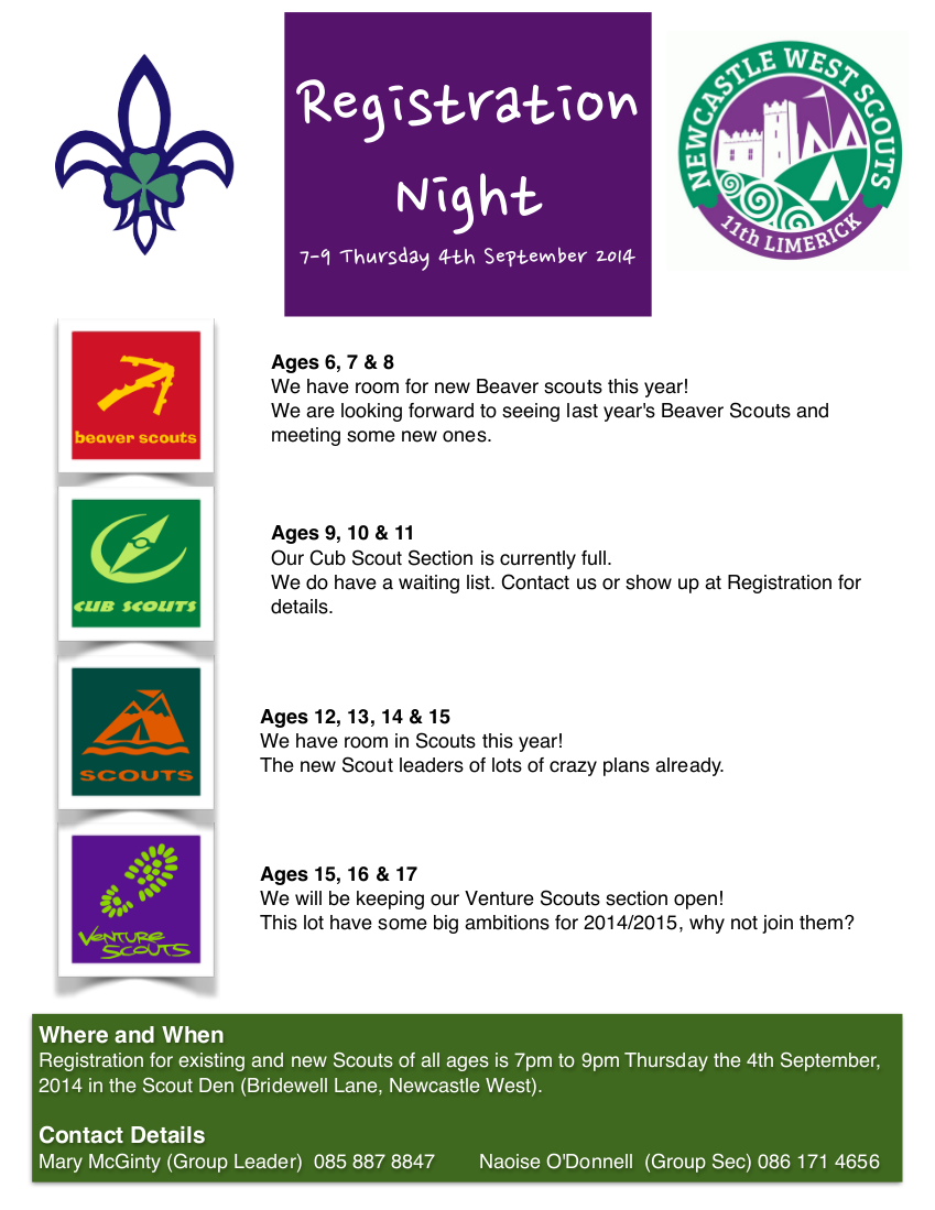 Registration for 2014/2015 is Thursday 4th September, 2014 from 7pm – 9pm in the Den.